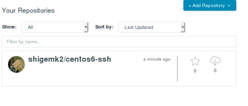なんでもいいからとりあえずコンテナを作る コミットする $ sudo docker commit 15e6be91e428 shigemk2/centos6-ssh DockerHubに登録する GitHub経由で登録できます プッシュする $ sudo docker push shigemk2/centos6-ssh 以上。 GitHubと連携できるんだっ…