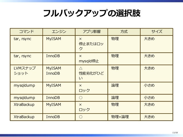2017-12-02 MySQL backup MySQL 論理バックアップ mysqldumpとかのコマンドでエクスポートする mysqldumpはシングルスレッド 物理バックアップ データベースのファイルを所定のディレクトリにコピーする rsyncとか RDSはSSHログイン出来ないのでこの方法は使えない XtraBackupも一部の方法でコレ(でもマルチスレッド) MySQLのバックアップ運用について色々 from yoku0825